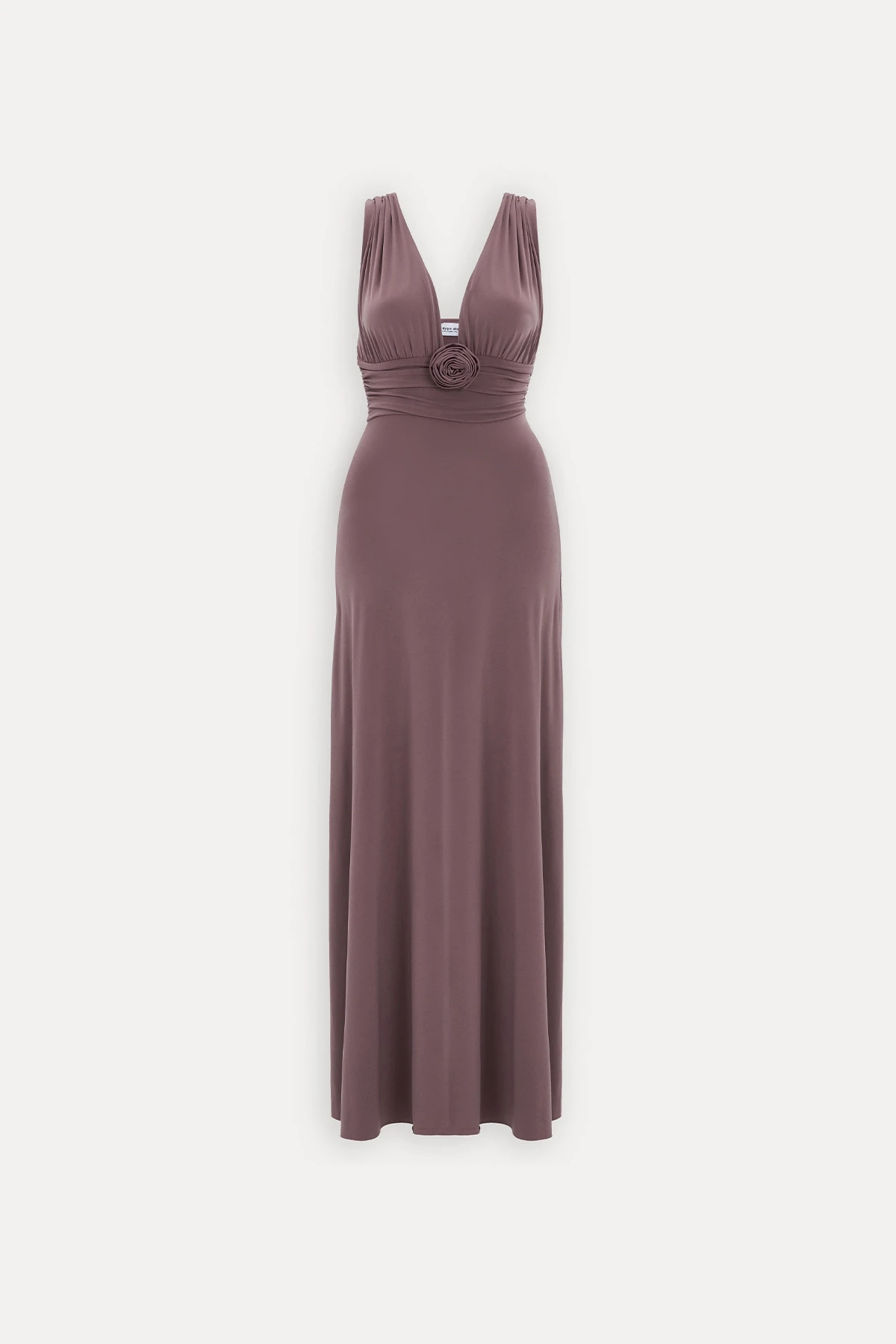 Plum Rose Detail Long Dress The image shows size XS. Made of Sandy fabric. Dress Length: 147 cm, Chest: 35 cm, Waist: 25 cm Model Measurements Height 158 Weight 52 Chest 80 Waist 62 Hip 93