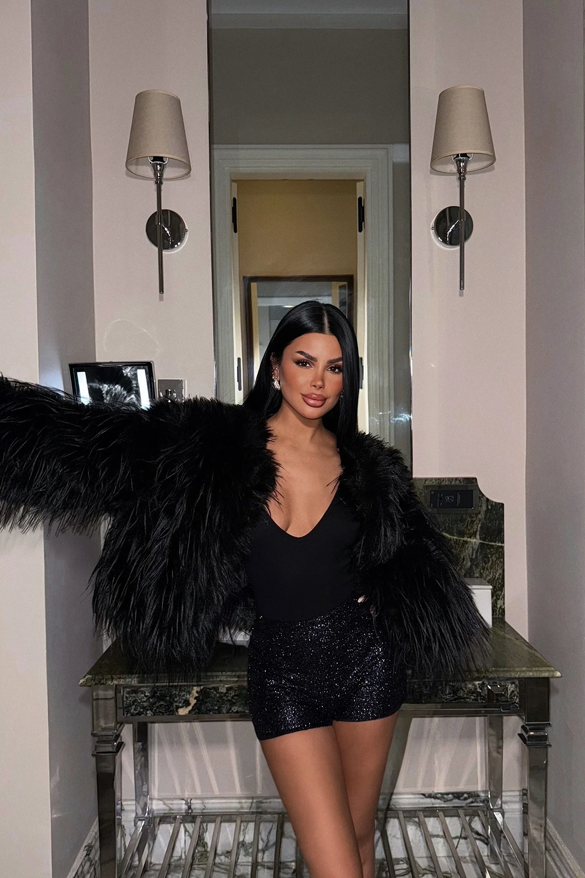 Purple Sequin Detail Shorts Size XS is used in the image. Height: 31 cm Waist: 34 cm Model Measurements Height 158 Weight 52 Chest 80 Waist 62 Hip 93