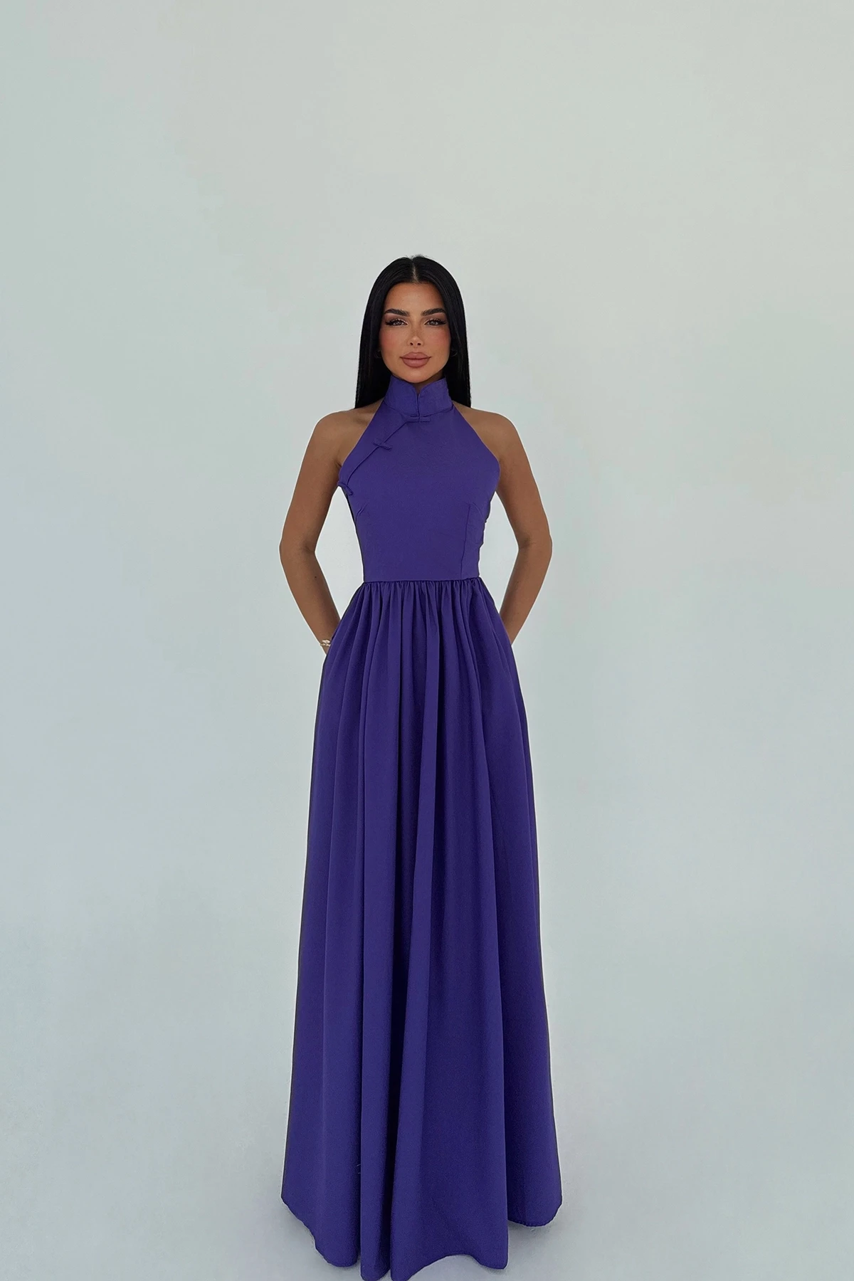 Purple Tania Dress XS size is used in the image. Made of Poplin Fabric. Length: 147 cm Waist: 29 cm Chest: 32 cm Model Measurements Height 158 Weight 52 Chest 80 Waist 62 Hip 93
