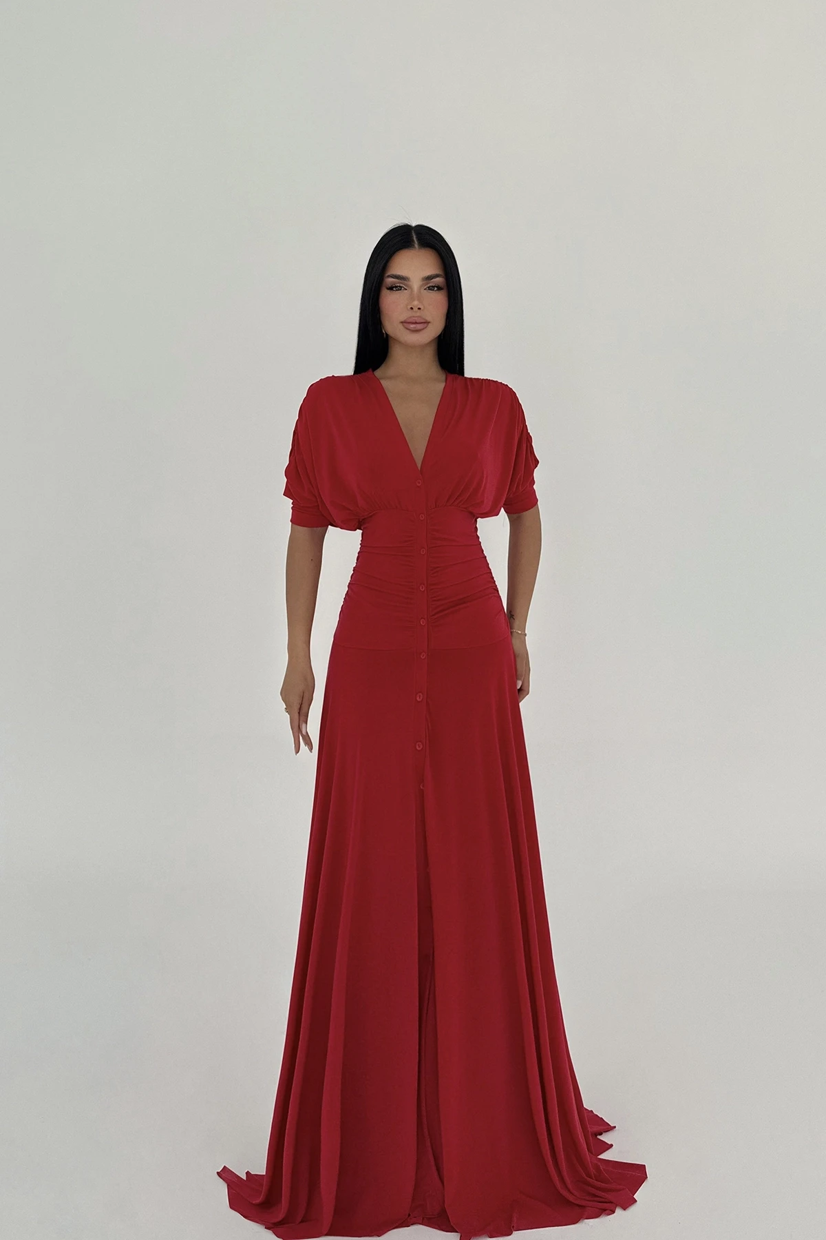 Red Eliah Long Buttoned Dress XS size is used in the image. Made of Sandy Fabric. Length: 168 cm Waist: 30 cm Chest: 36 cm Model Measurements Height 158 Weight 52 Chest 80 Waist 62 Hip 93