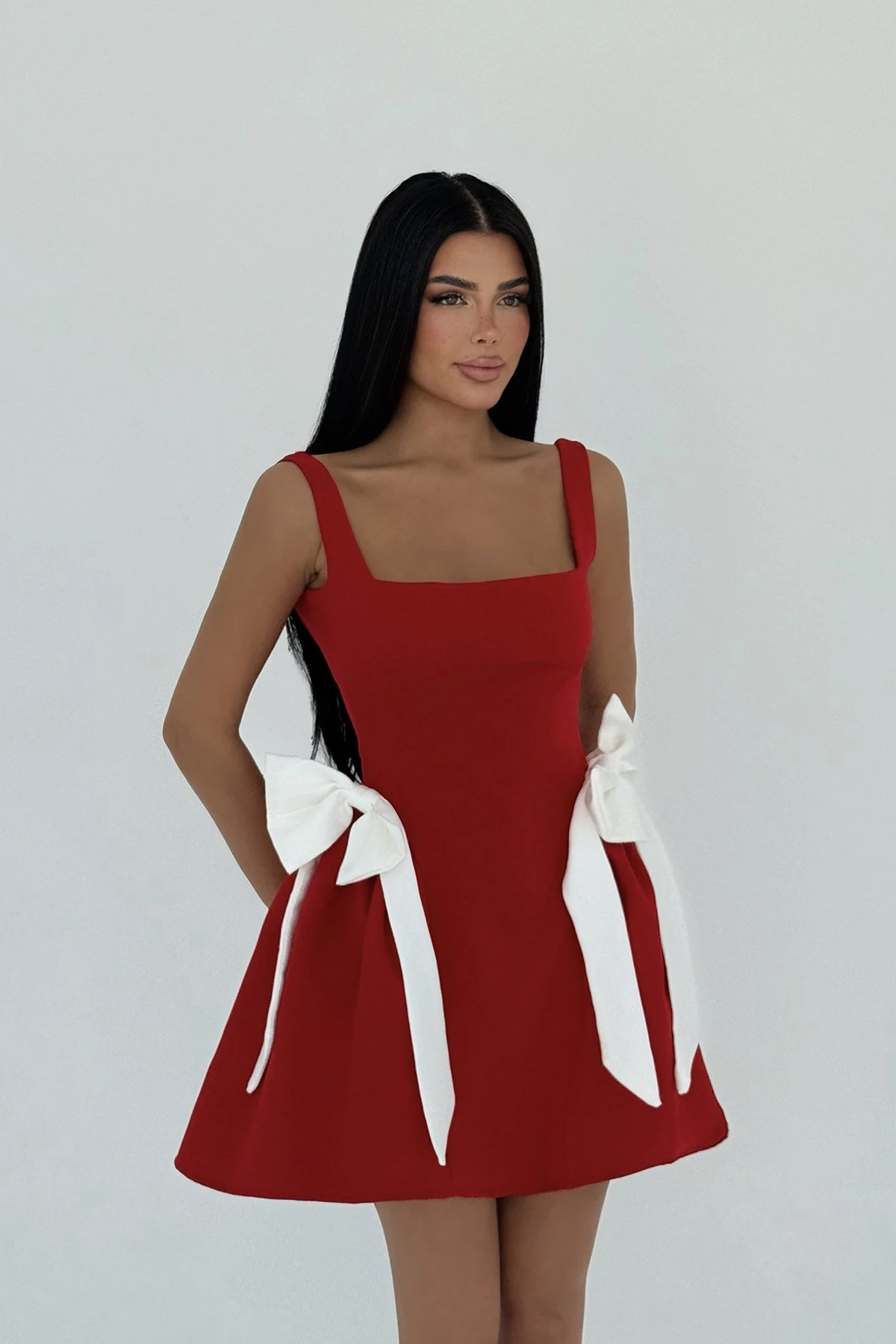 Red Nellie Bow Detail Mini Dress The image uses size XS. Length: 76 cm Waist: 43 cm Chest: 41 cm Model Measurements Height 158 Weight 52 Chest 80 Waist 62 Hip 93