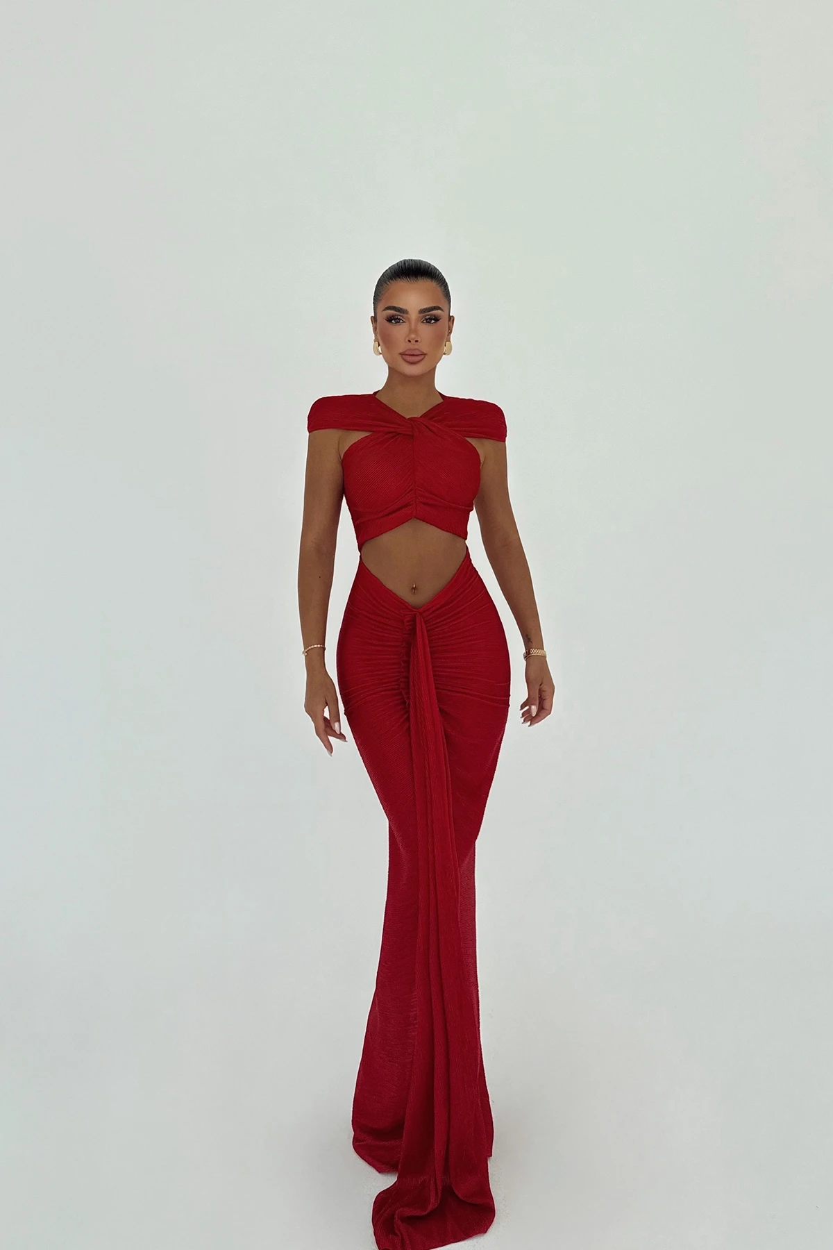 Red Orleans Long Dress The image shows size XS. Height: 155 cm Waist: 27 cm Chest: 35 cm Model Measurements Height: 160 Weight: 50 Chest: 80 Waist: 62 Hip: 94
