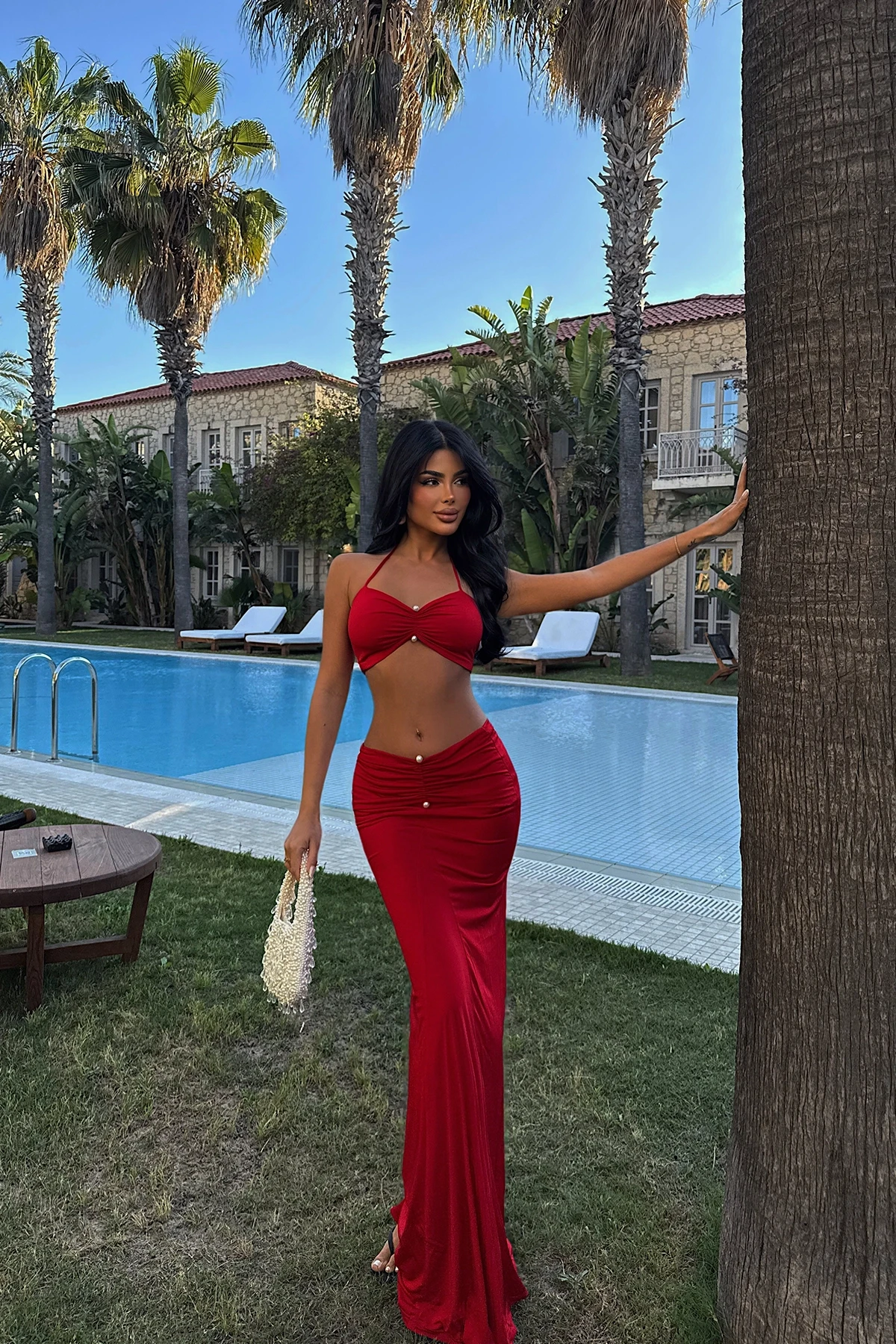 Red Romy Suit Size S is used in the image. Made of Sandy fabric Suit top length 38 cm, Chest 48 cm, Bottom length 38 cm, Waist 34 cm Model Measurements: Height: 160 Weight: 50 Chest: 80 Waist: 62 Hip: 94