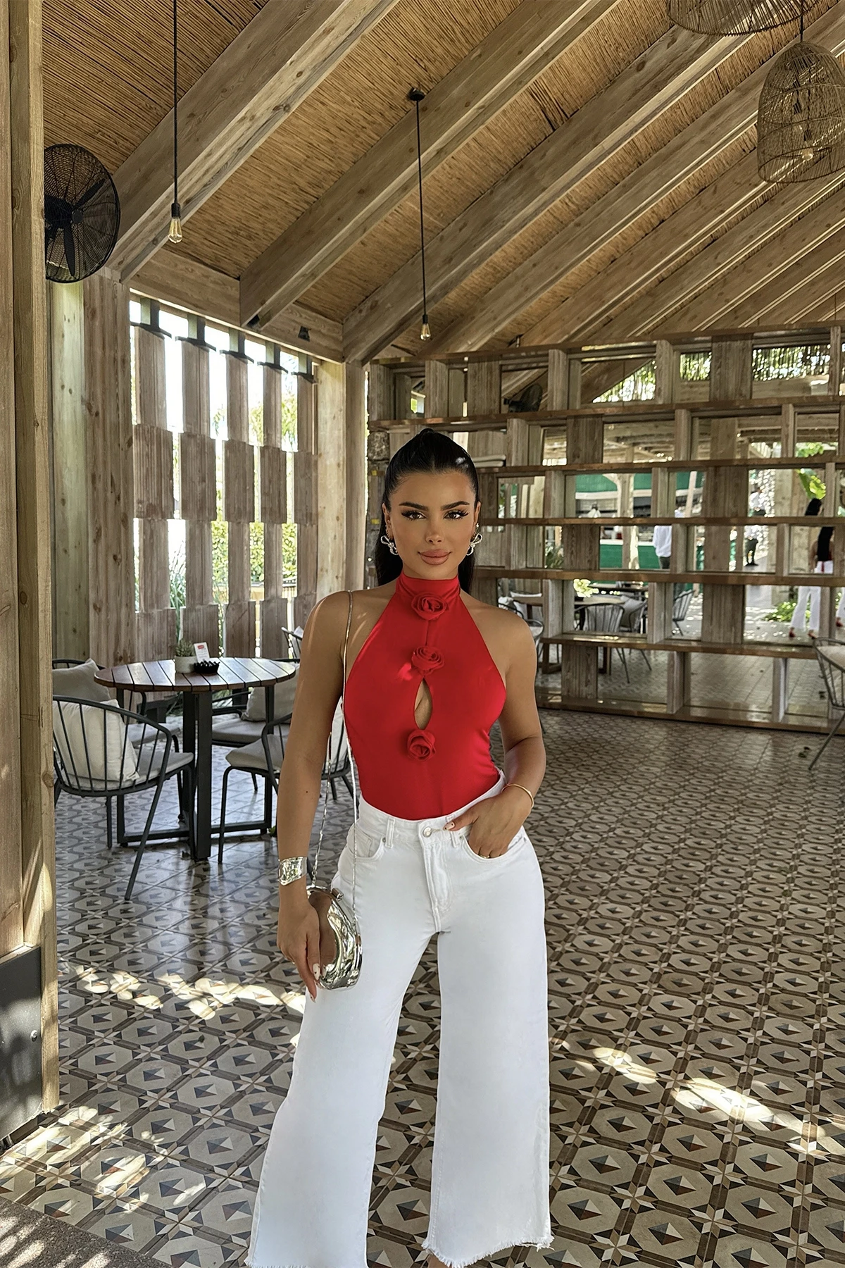 Red Rose Detail Tied Bodysuit Made from Sandy Fabric Size S is used in the image Bodysuit Length:79cm Bust:30cm Model Measurements: Height: 160 Weight: 50 Chest: 80 Waist: 62 Hip: 94