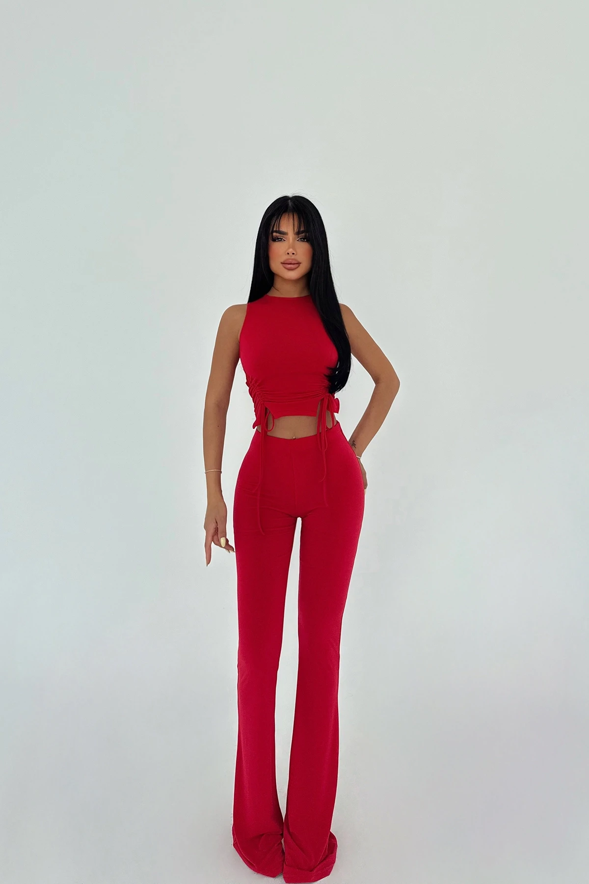 Red Trouser Suit XS size is used in the image. Made of Sandy Fabric. Upper Length: 45 cm Chest: 35 cm Lower Length: 106 cm Waist: 32 cm Model Measurements Height 158 Weight 52 Chest 80 Waist 62 Hip 93