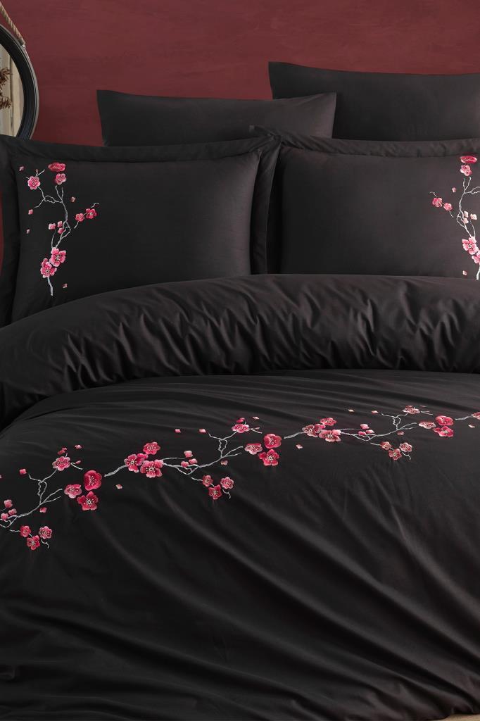 Sakura Nakışlı %100 Pamuk Çift Kişilik Nevresim Takımı Siyah