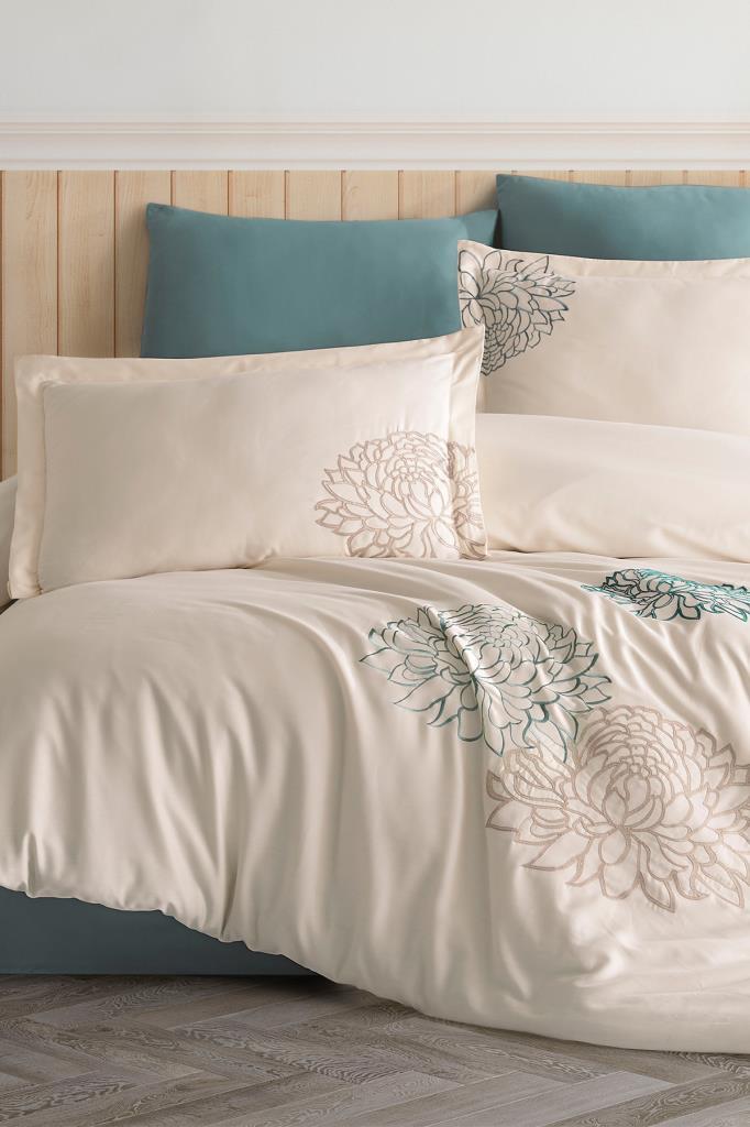 Siena Nakışlı %100 Pamuk Saten Çift Kişilik Nevresim Takımı Şampanya