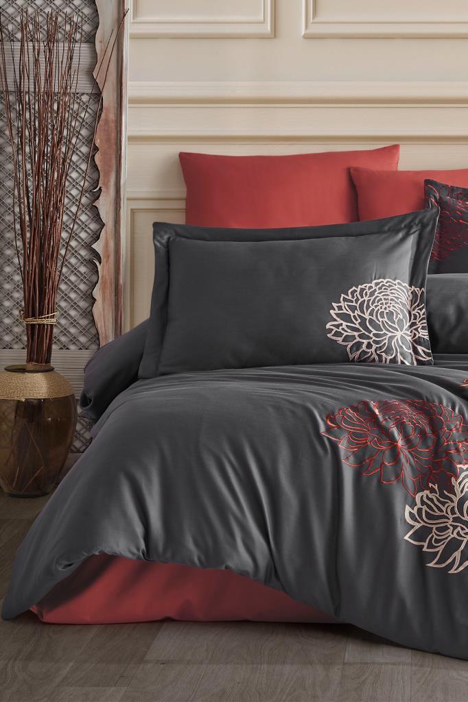 Siena Nakışlı %100 Pamuk Saten Çift Kişilik Nevresim Takımı Antrasit