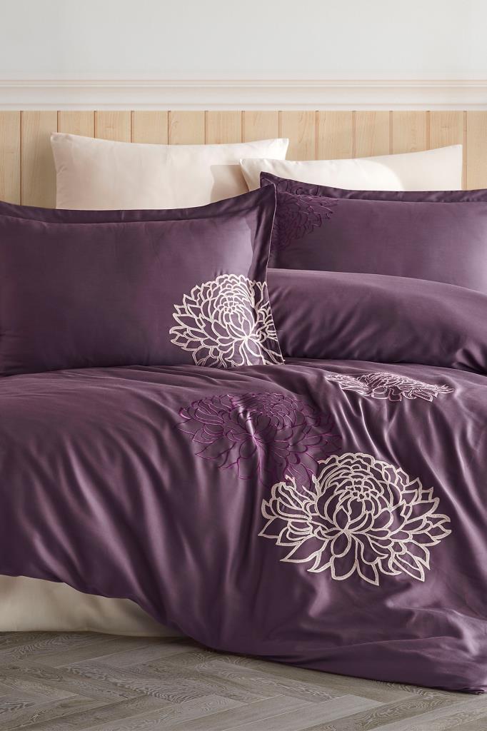 Siena Nakışlı %100 Pamuk Saten Çift Kişilik Nevresim Takımı Mürdüm