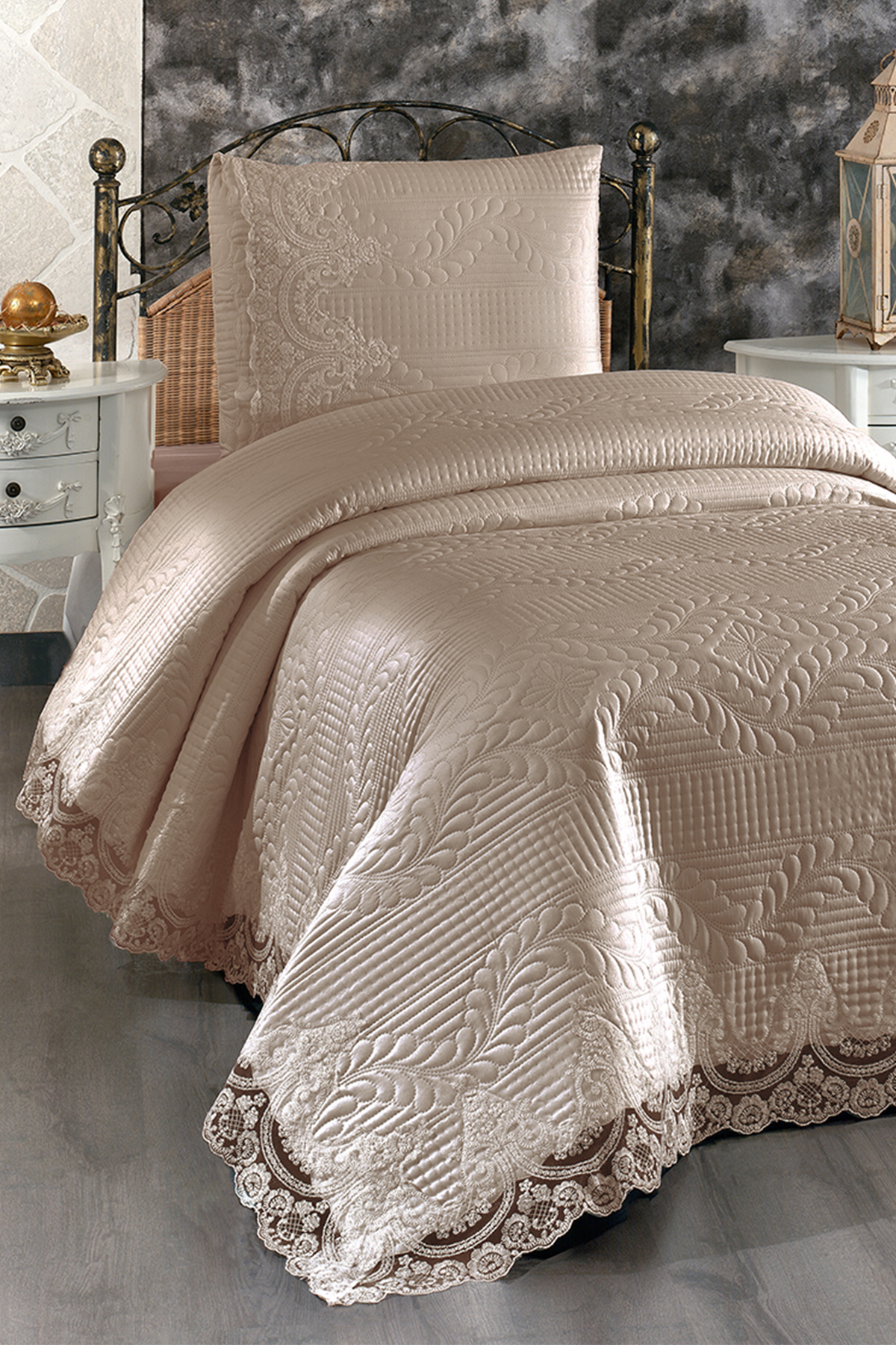 Simirna Dantelli Kapitoneli Tek Kişilik Yatak Örtüsü Açık Cappucino