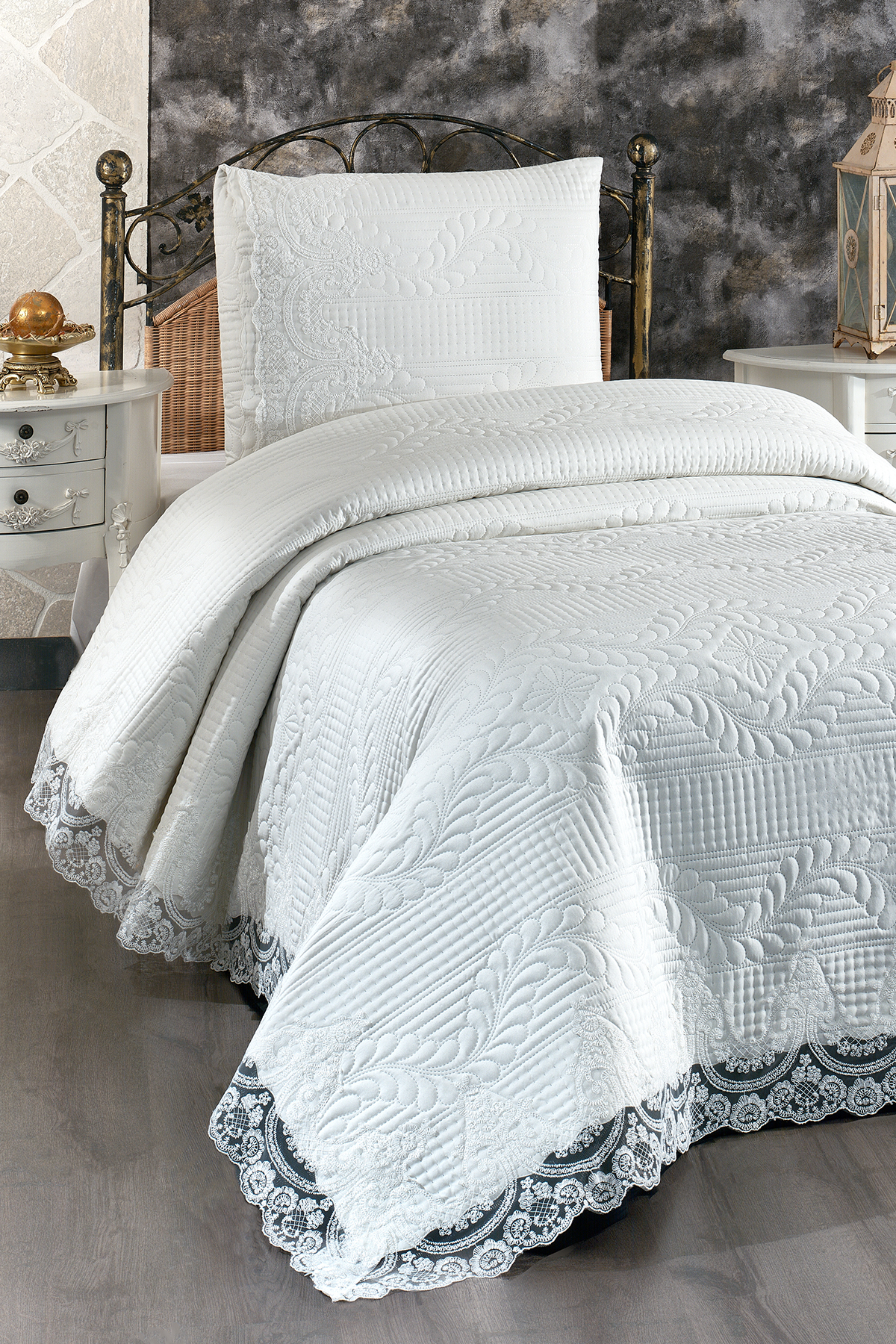 Simirna Dantelli Kapitoneli Tek Kişilik Yatak Örtüsü Krem