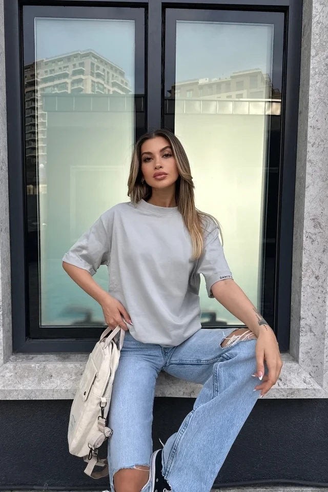 Stone Sleeve Written Basic T-Shirt It is made of combed cotton fabric. Size S is used in the image. T-shirt length is 75 cm, chest is 60 cm. Model Measurements: Height: 171 Weight: 55 Chest: 85 Waist: 65 Hip: 105
