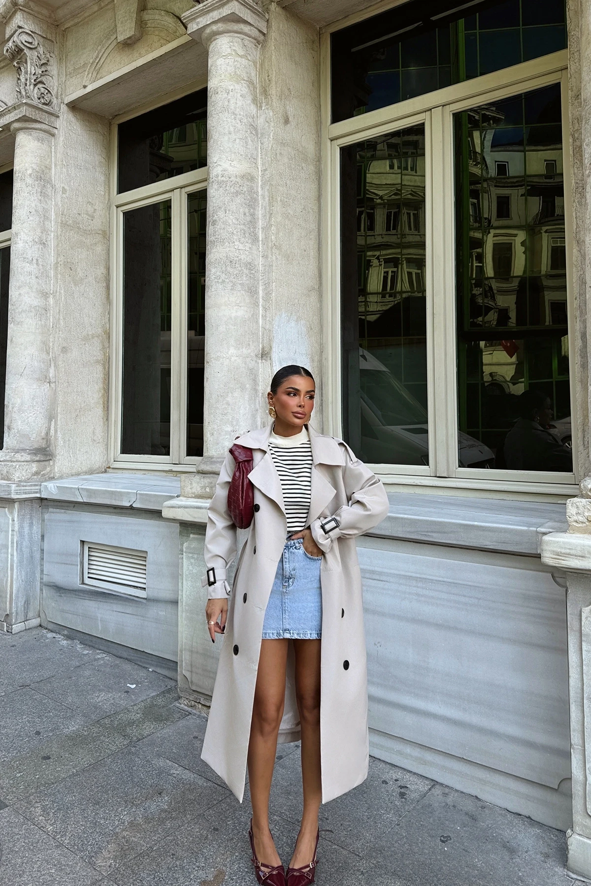Stone Sleeves Belted Trench Coat Size XS is used in the image. Trench Coat Length: 115cm Chest: 45cm Model Measurements Height 158 Weight 52 Chest 80 Waist 62 Hip 93