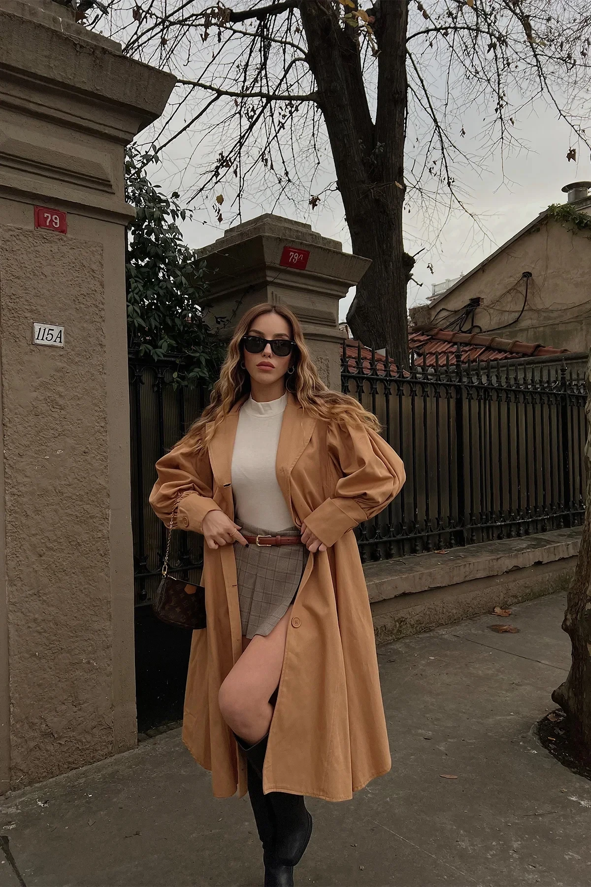 Tan Button Front Trench Coat Size S-M is Used in the Image Trench Coat Length: 111cm Chest: 56cm Model Measurements Height 168 Weight 50 Chest 80 Waist 60 Hip 90