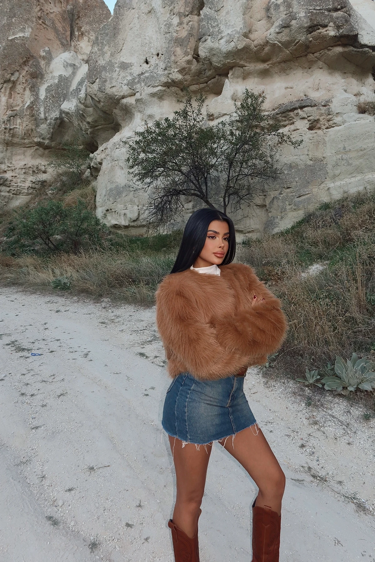 Tan Short Fur Size XS is used in the image. Fur Length: 53 Cm Chest: 51 Cm Made from Lolita Fabric. Model Measurements Height 158 Weight 52 Chest 80 Waist 62 Hip 93