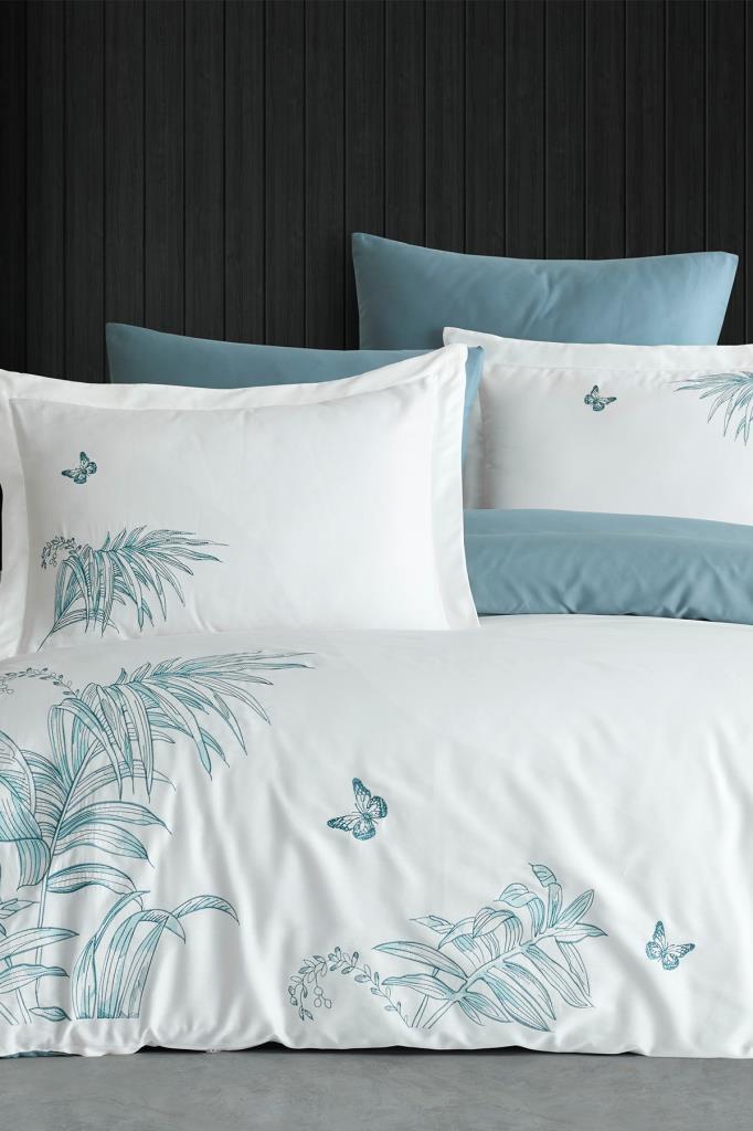 Tropical Nakışlı %100 Pamuk Saten Çift Kişilik Nevresim Takımı Krem Yeşil