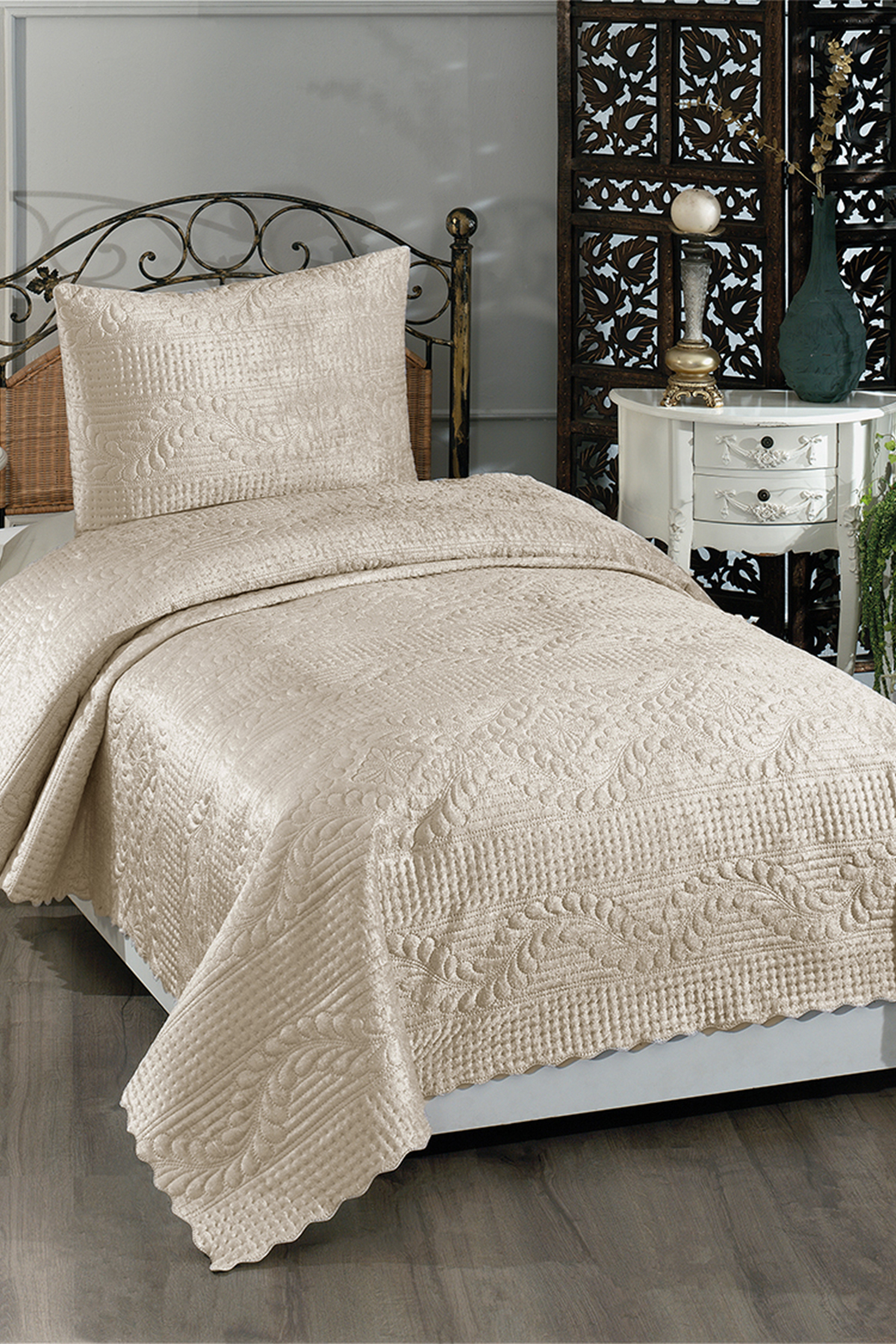 Velica Tek Kişilik Kadife Yatak Örtüsü Krem