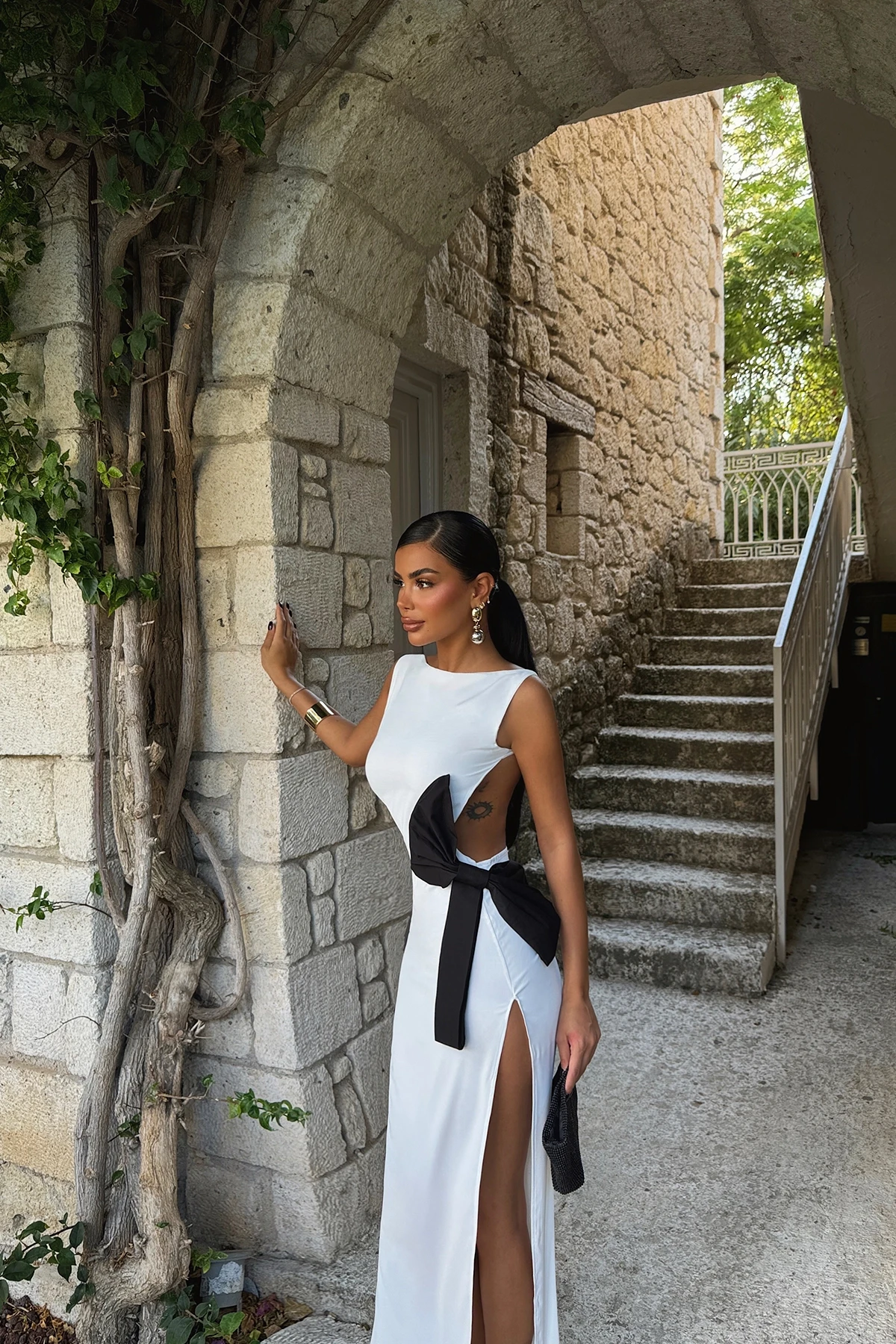 White Bow Detail Long Dress XS size is used in the image. Made of Dubai Fabric. Length: 150 cm Waist: 35 cm Chest: 38 cm Model Measurements Height 158 Weight 52 Chest 80 Waist 62 Hip 93