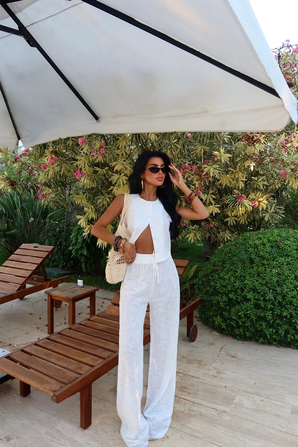 White Button Detail Suit Made of Linen Fabric. Top Length: 45 cm, Chest: 43 cm, Bottom Length: 112 cm, Waist: 38 cm Size XS is used in the image. Model Measurements: Height 158 cm, Weight 52 cm, Chest 80 cm, Waist 62 cm, Hips 93 cm