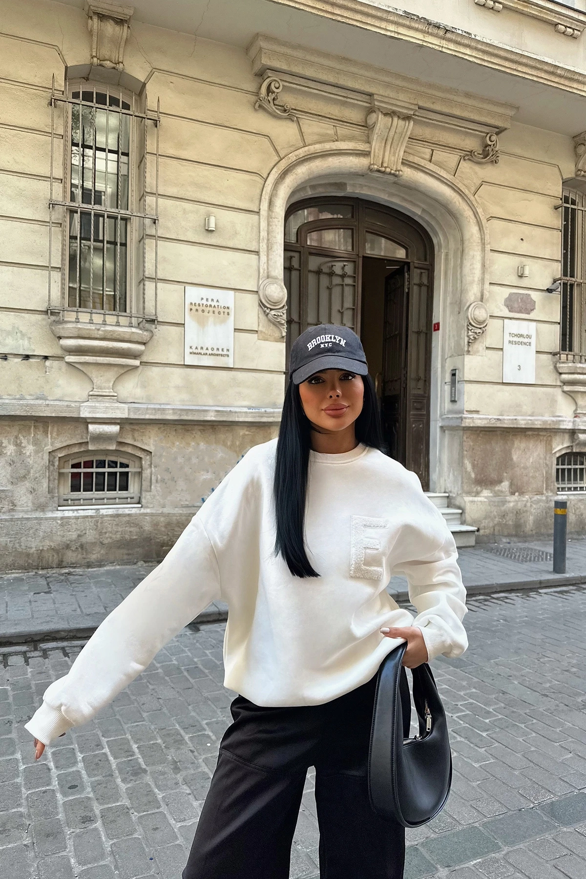White E Embroidered Sweat Made from Three Thread Fabric SSTD size is used in the image Sweat Length:67cm Chest:60cm Model Measurements: Height: 160 Weight: 50 Chest: 80 Waist: 62 Hip: 94