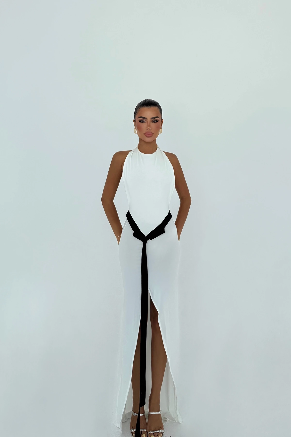 White Front Tie Long Dress XS size is used in the image. Made of Sandy Fabric. Height: 148 cm Waist: 29 cm Chest: 26 cm Model Measurements Height: 160 Weight: 50 Chest: 80 Waist: 62 Hip: 94
