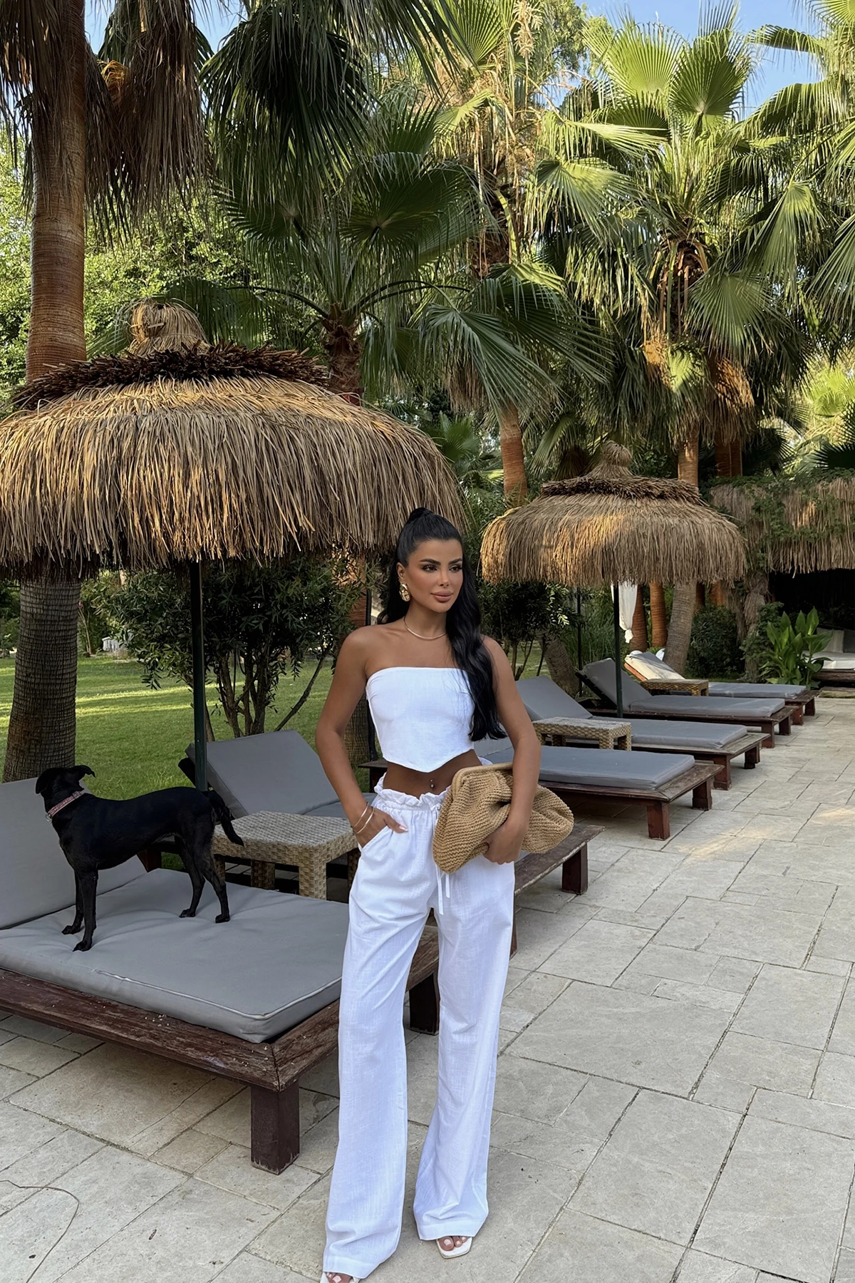 White Trouser Suit  Size S is used in the image. Made from linen fabric. Suit Top Length 23 cm, Chest 39 cm, Bottom Length 104 cm, Waist 31 cm Model Measurements: Height: 160 Weight: 50 Chest: 80 Waist: 62 Hip: 94