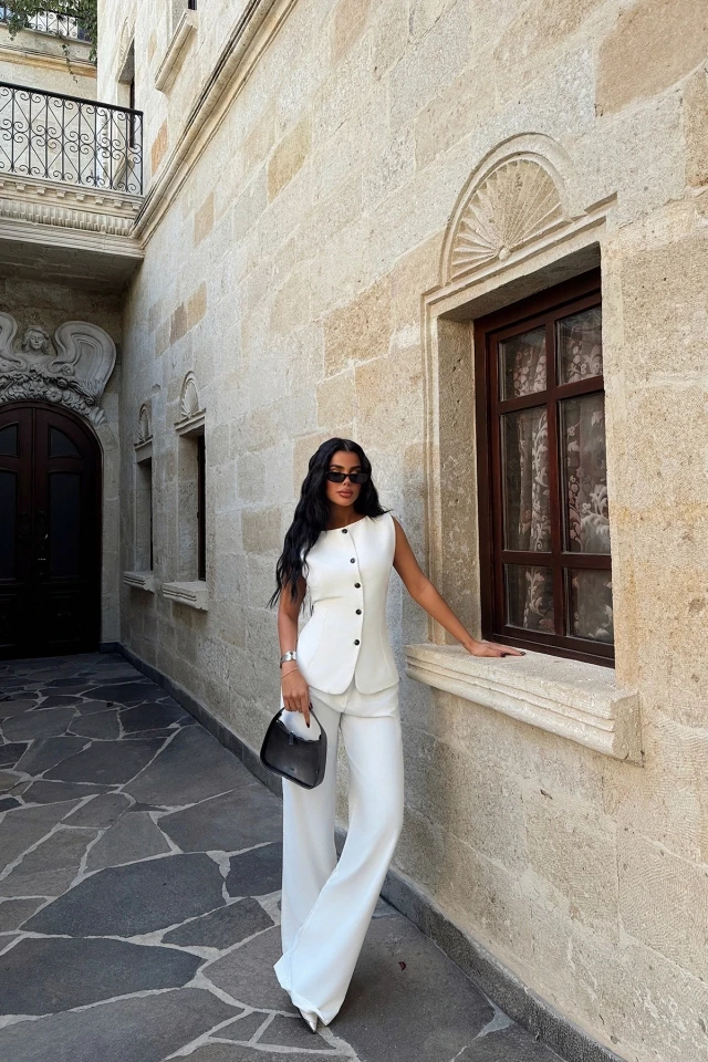 White Lamarie Tie Waist Bottom Top Set Size XS is used in the image. Made from Linen Fabric. Top Length: 62 Cm Bust: 49 Cm Bottom Length: 110 Cm Waist: 35 Cm Model Measurements Height 158 Weight 52 Chest 80 Waist 62 Hip 93