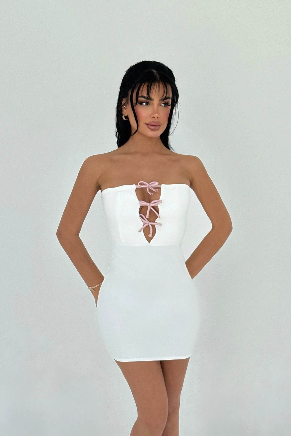White Liesel Ribbon Detail Mini Dress XS size is used in the image. Made of Double-Satin Fabric. Length: 60 cm Waist: 32 cm Chest. 37 cm Model Measurements Height 158 ​​Weight 52 Chest 80 Waist 62 Hip 93