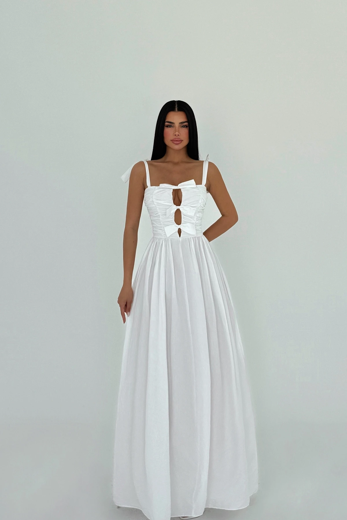 White Mirabelle Long Dress Made of Poplin Fabric. Length: 120 cm Waist: 32 cm Chest: 40 cm XS size is used in the image. Model Measurements Height 158 ​​Weight 52 Chest 80 Waist 62 Hip 93