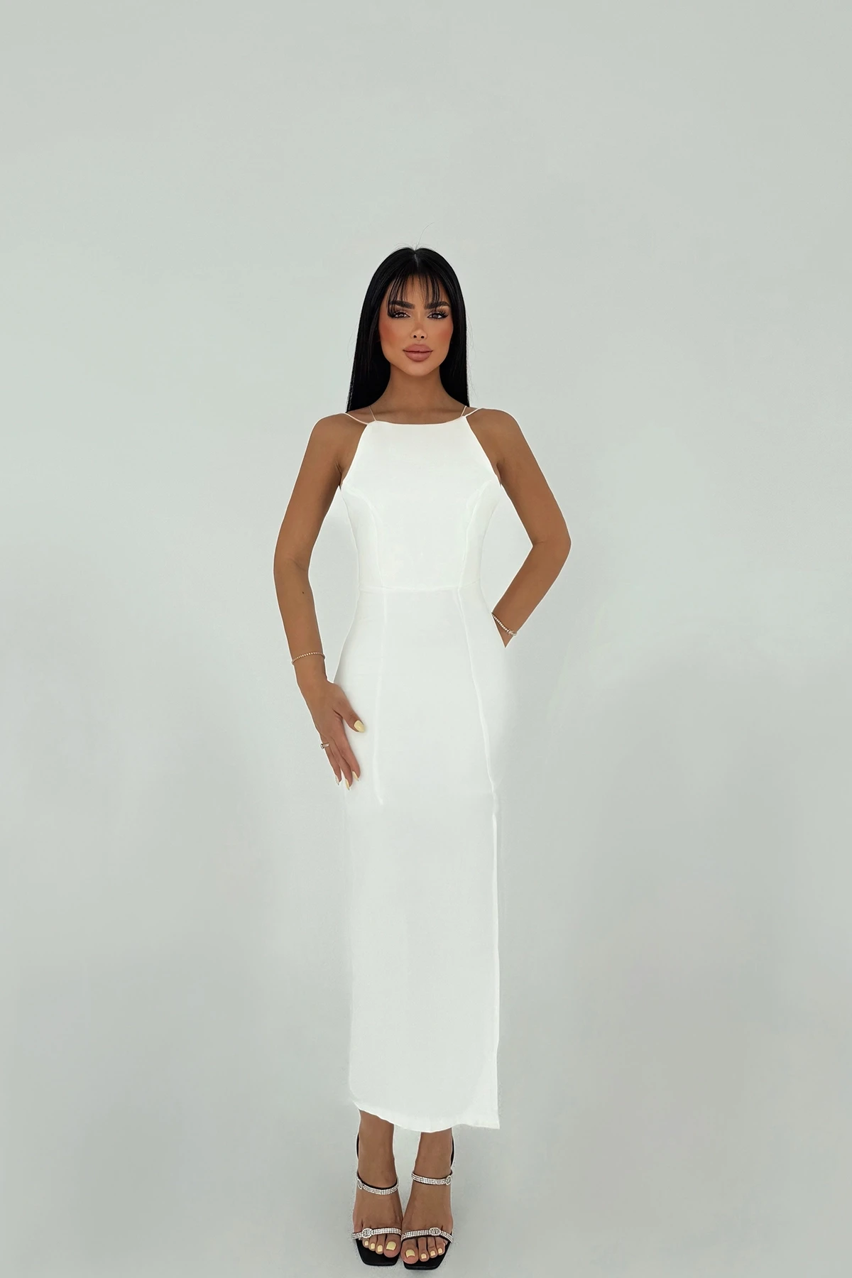 White Rope Strap Back Detail Mini Dress XS size is used in the image. Made of crepe fabric Dress Length: 125 cm, Chest: 36 cm, Waist: 33 cm Model Measurements Height 158 Weight 52 Chest 80 Waist 62 Hip 93