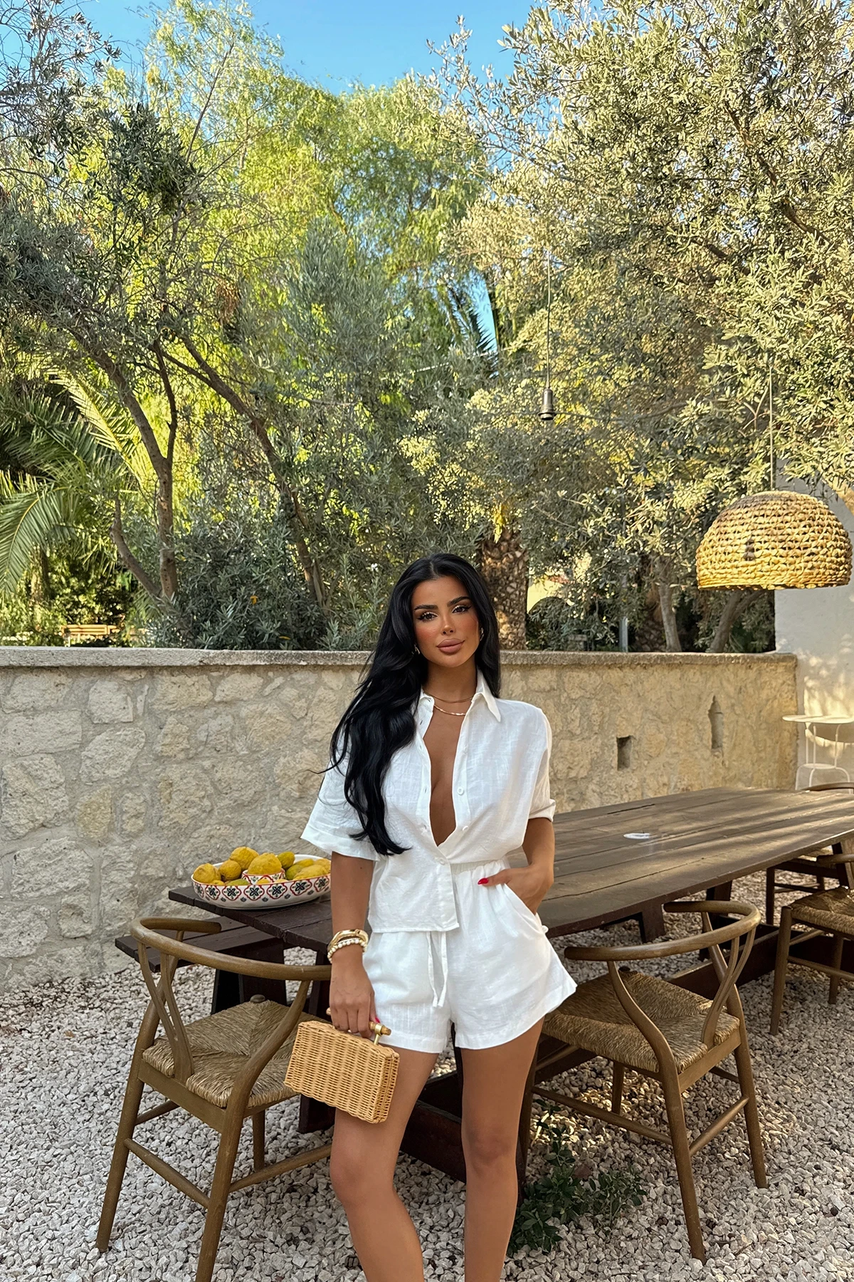 White Shirt Suit Made from linen fabric Size S is used in the image. Suit top length 53 cm, Chest 52 cm, Bottom length 38 cm, Waist 29 cm Model Measurements: Height: 160 Weight: 50 Chest: 80 Waist: 62 Hip: 94