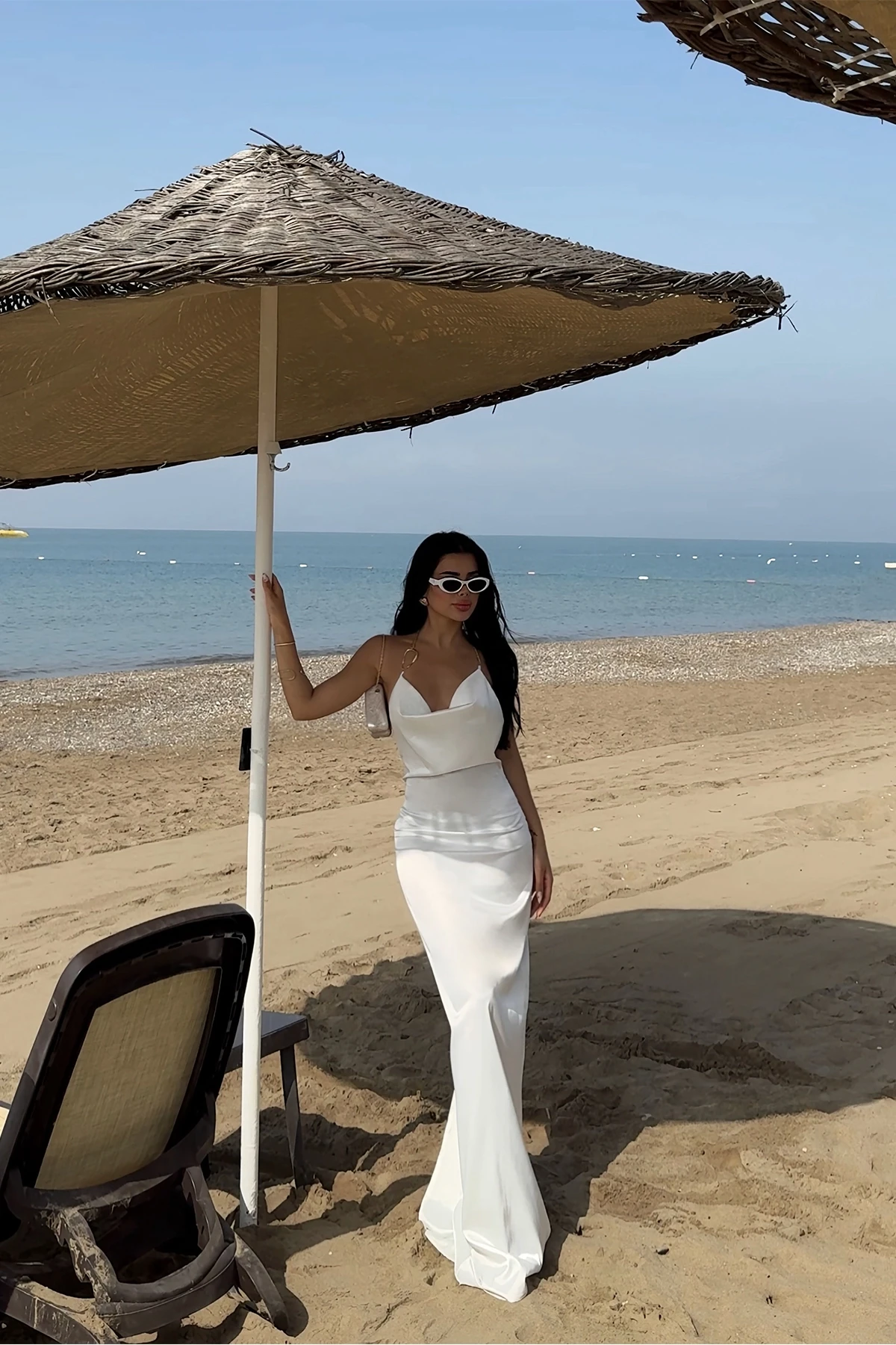 White Sofia Dress Made from Satin Fabric Image size S is used Dress Length: 145 Cm Bust: 37 Cm Waist: 34 Cm Hips: 46 Cm Model Measurements: Height: 160 Weight: 50 Chest: 80 Waist: 62 Hip: 94