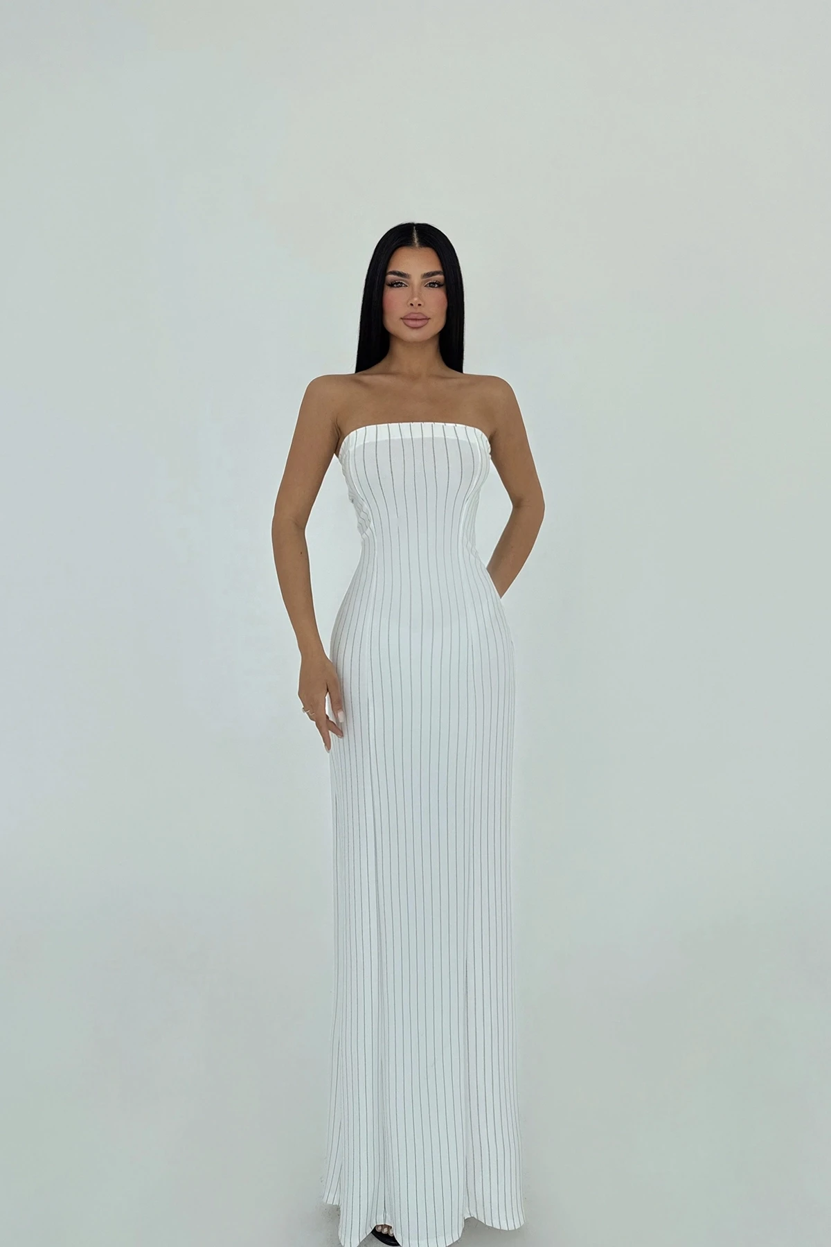 White Strapless Striped Dress Made from Atlas Fabric Image size S is used Dress Length: 125 Cm Chest: 38 Cm Hips: 49 Cm Waist: 34 Cm Model Measurements: Height: 160 Weight: 50 Chest: 80 Waist: 62 Hip: 94