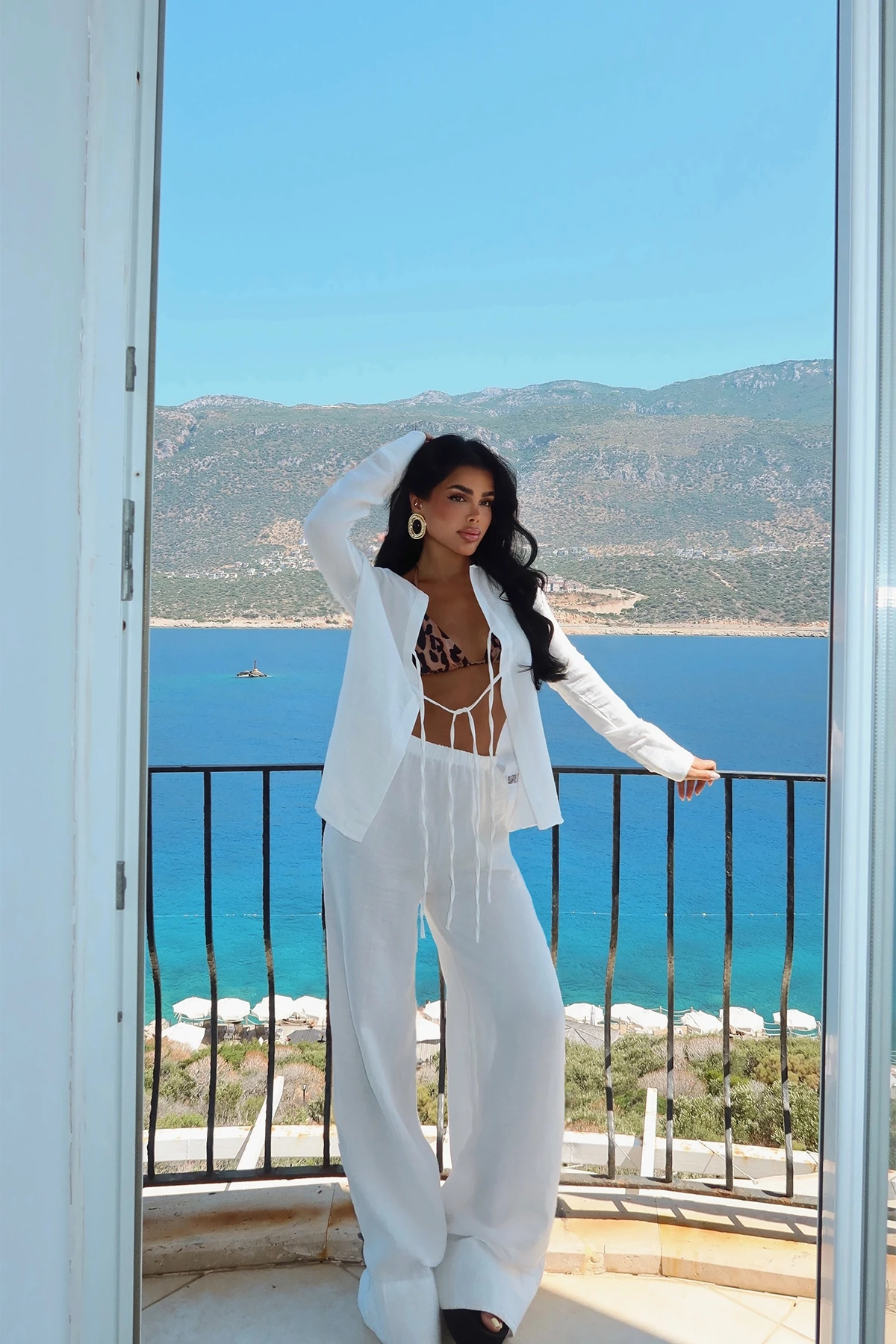 White Tied Trouser Suit Made of Muslin Fabric. The image shows size XS. Top Length: 64 cm Chest: 60 cm Bottom Length: 111 cm Waist: 36 cm Model Measurements Height 158 Weight 52 Chest 80 Waist 62 Hip 93