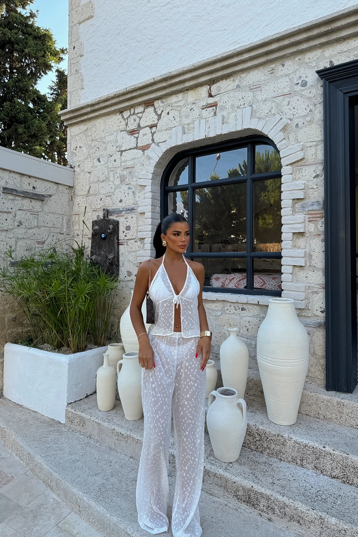 White Tulle Trousers Set Size S is used in the image. It is made of tulle fabric. Suit top length 42 cm, Chest 41 cm, Bottom length 107 cm, Waist 32 cm Model Measurements: Height: 160 Weight: 50 Chest: 80 Waist: 62 Hip: 94