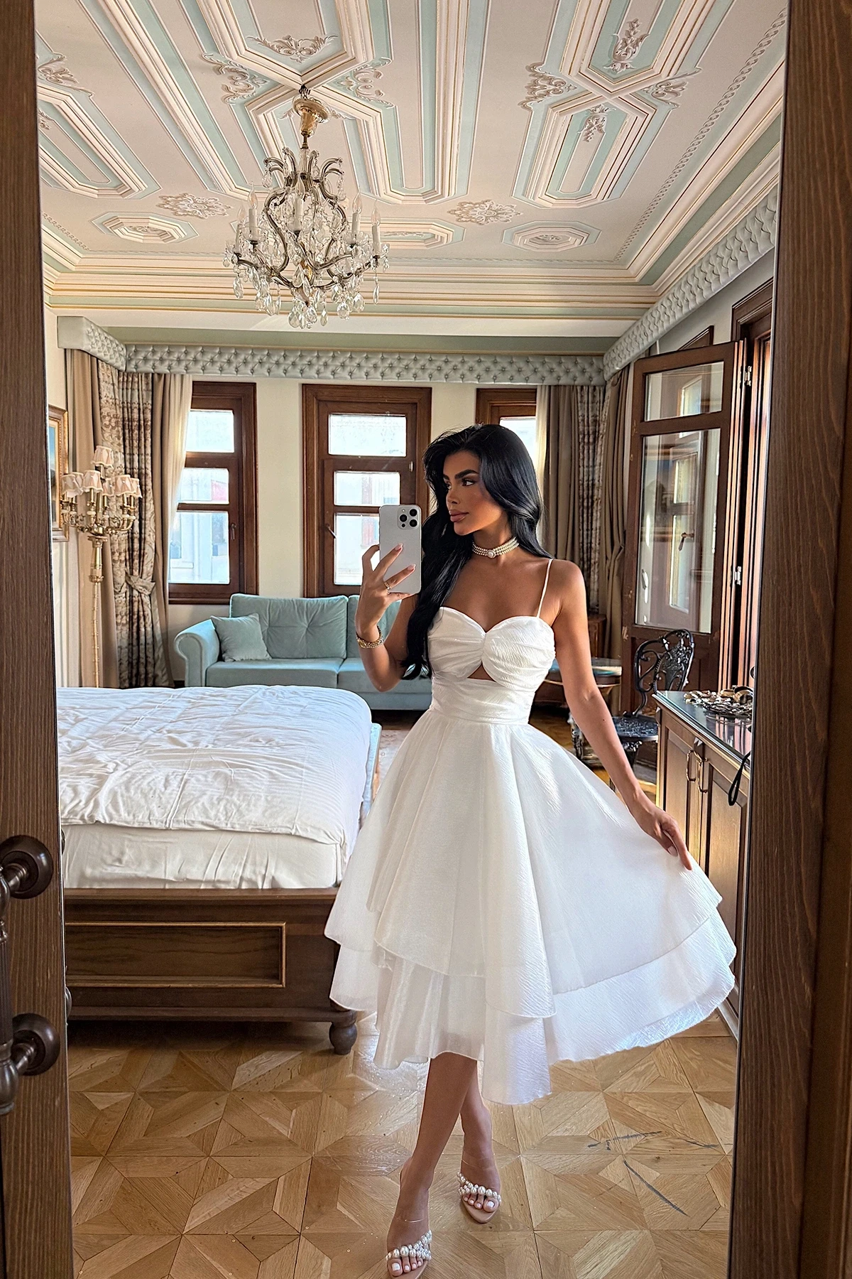 White Window Detail Mini Dress Length: 103 cm, Waist: 35 cm, Chest: 40 cm Size 36 is used in the image. Model Measurements: Height: 158 cm, Weight: 52 cm, Chest: 80 cm, Waist: 62 cm, Hip: 93 cm