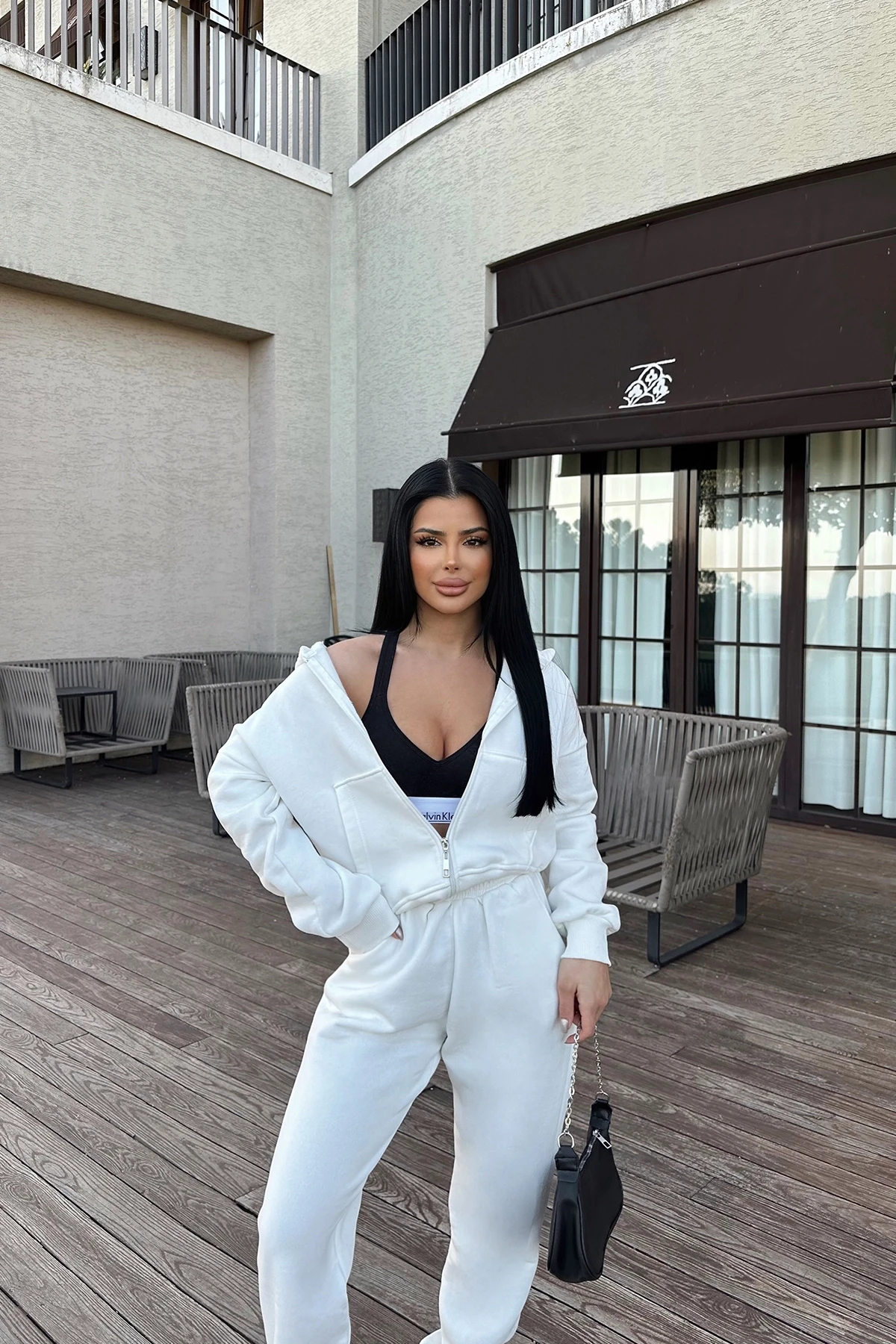 White Zipper Detail Trousers Set It is made of Three Thread Raster fabric. Size S is used in the image. Suit top length 52cm, Chest 52cm, Bottom length 100cm, Waist 36cm Model Measurements: Height: 160 Weight: 50 Chest: 80 Waist: 62 Hip: 94