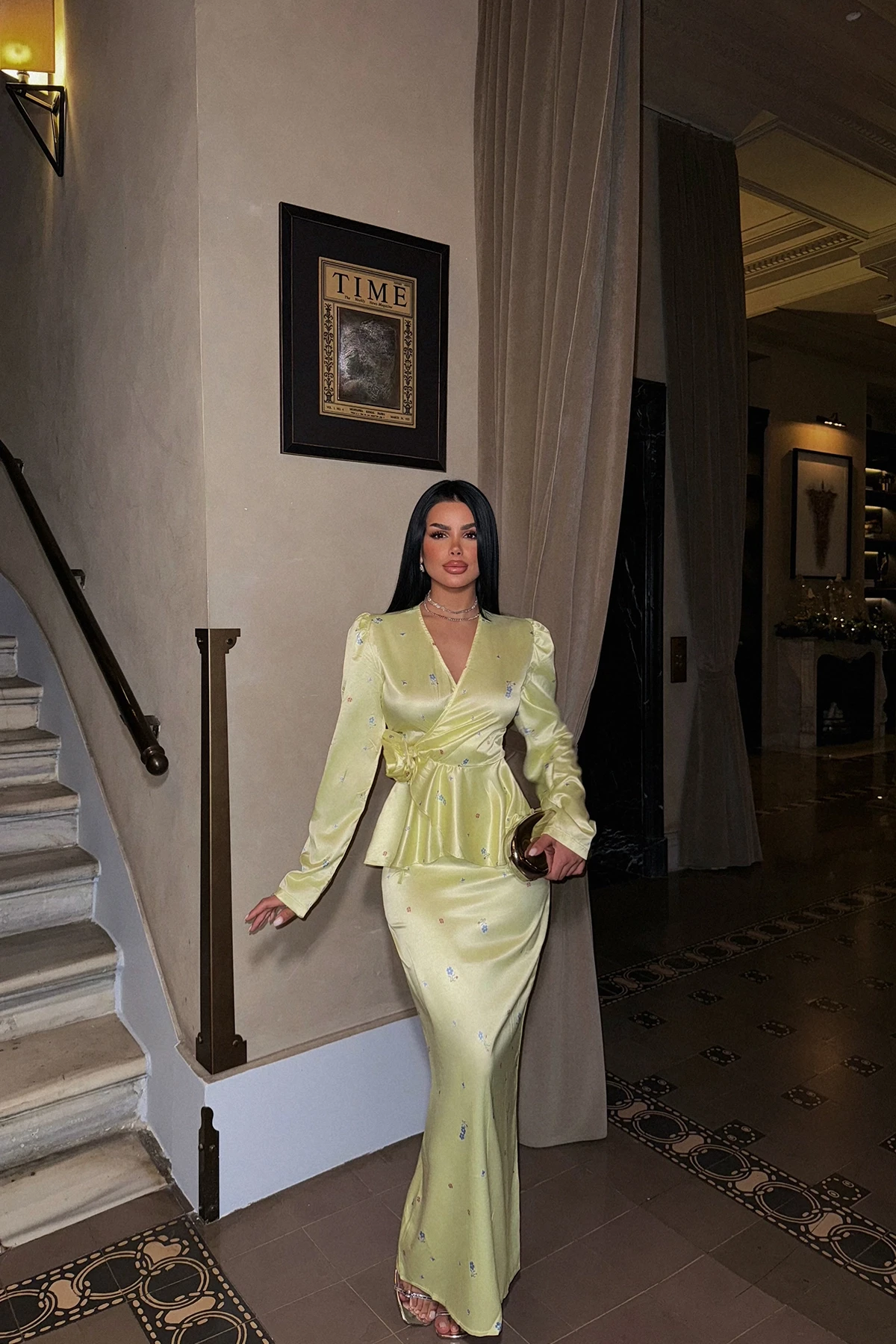 Yellow Rose Detail Satin Set Size XS is used in the image. Made from Satin Fabric. Top Length: 58 Cm Bust: 44 Cm Bottom Length: 95 Cm Waist: 37 Cm Model Measurements Height 158 Weight 52 Chest 80 Waist 62 Hip 93