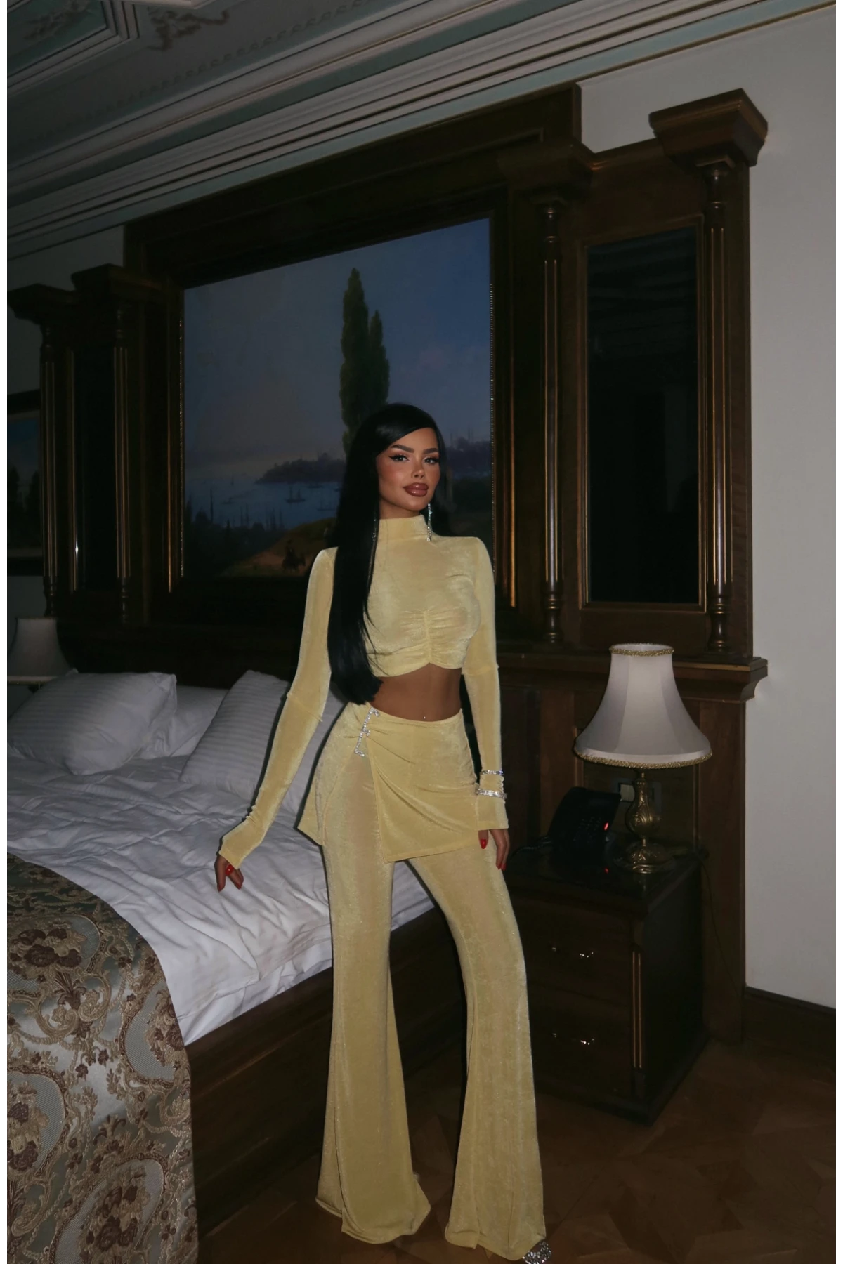 Yellow Tiani Stone Accessory Set XS size is used in the image. Made of Buzzy Fabric. Top Length: 39 cm Chest: 35 cm Bottom Length: 105 cm Waist: 39 cm Model Measurements Height 158 Weight 52 Chest 80 Waist 62 Hip 93
